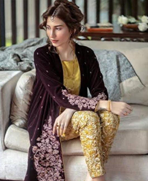 Crafted with elaborate silver and metallic golden work, this outfit enables maroon floor length jacket paired with an inner dress, made of pure georgette with pleated belt details,slightly fitted Trouser and heavily embroidered pants.