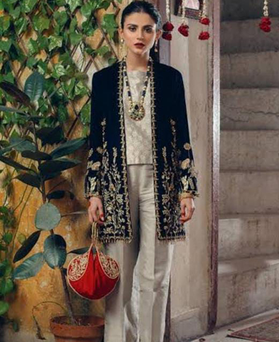 Enter a realm of velvet nights and silver whispers with this navy blue Outfit. The embroidered kalis weave tales of tradition, embellished with silver zari and cupped sequins that glisten like celestial bodies. The velvetdress is a canvas of elegance which envelopes you in its richness. Embroidered sleeves with borders and Open shirt border contribute to the poetic dance of design.